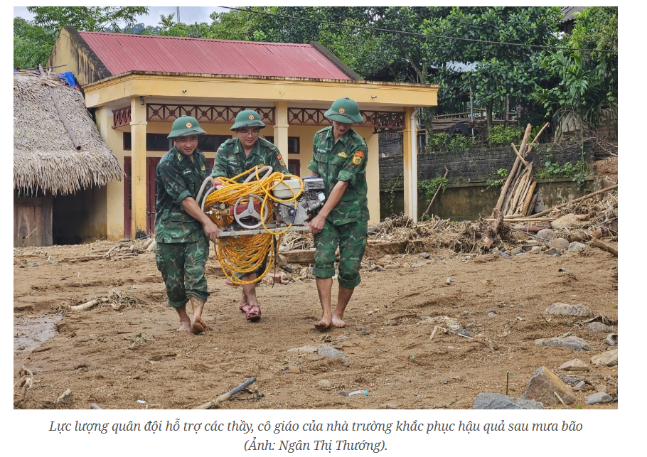 Thầy cô, chiến sĩ đội mưa dọn bùn đất chuẩn bị cho ngày khai...