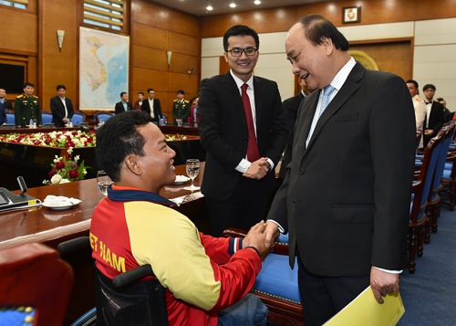 Thủ tướng thăm hỏi VĐV cử tạ Lê Văn Công. Ảnh: VGP/Quang Hiếu